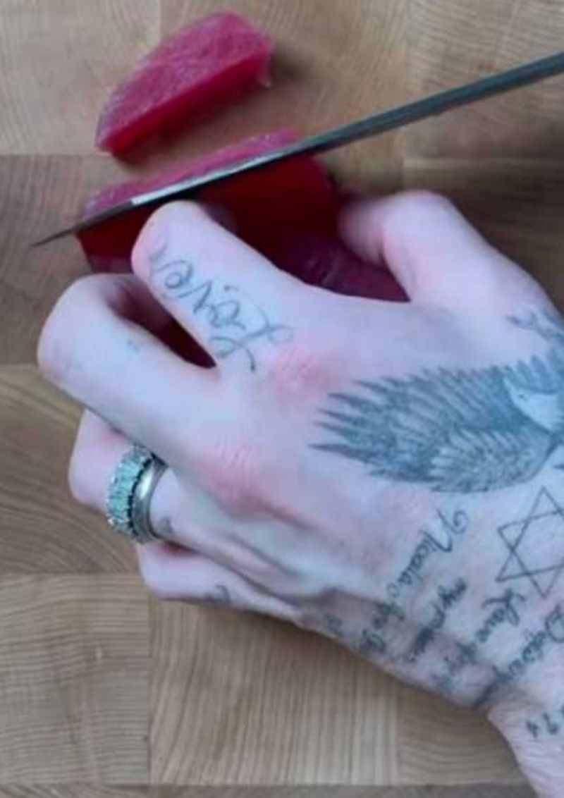 En el clip, el chef preparó un platillo de atún, mayonesa, arroz, aguacate, habas y cebollas, y mientras picaba los ingredientes deslumbró con su costosa joya.