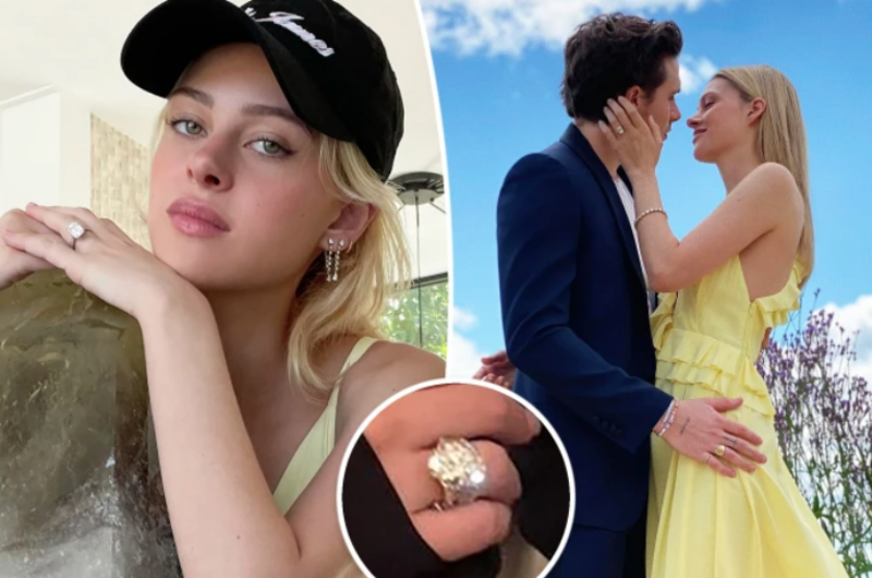 Brooklyn Beckham le propuso a Nicola Peltz matrimonio con un lujoso anillo de compromiso de más de nueve millones de dólares que tenía un diamante de corte esmeralda; sin embargo, después de su enlace matrimonial ya luce otra pieza de joyería, que se especula pudo haber heredado de su suegra, Victoria Beckham.