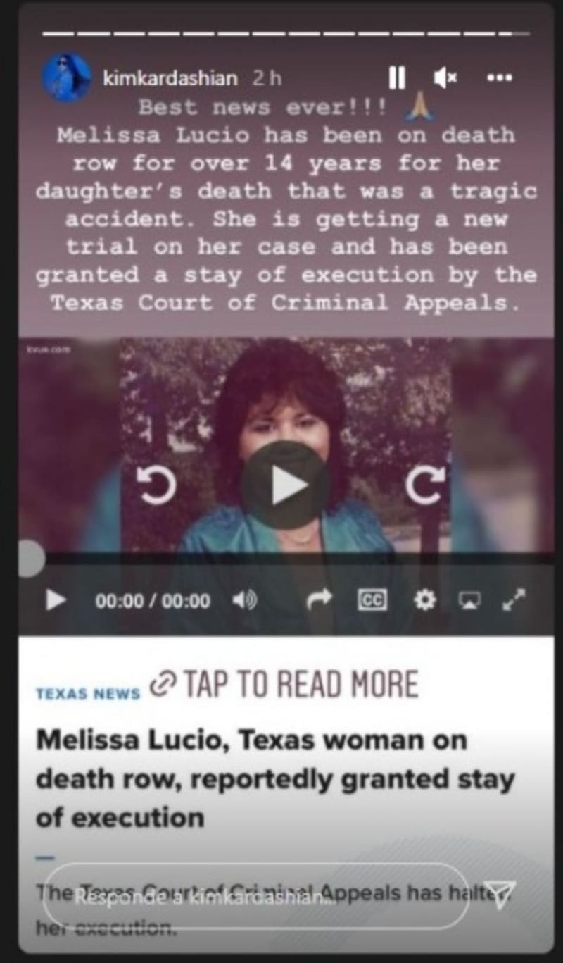 “La mejor de las noticias. Melissa Lucio ha estado, desde hace 14 años, en la fila de la muerte por el fallecimiento de su hija, que fue un accidente. Ahora tendrá un nuevo juicio sobre su caso y le han concedido la detención de su ejecución por la corte de Texas”, escribió la empresaria.