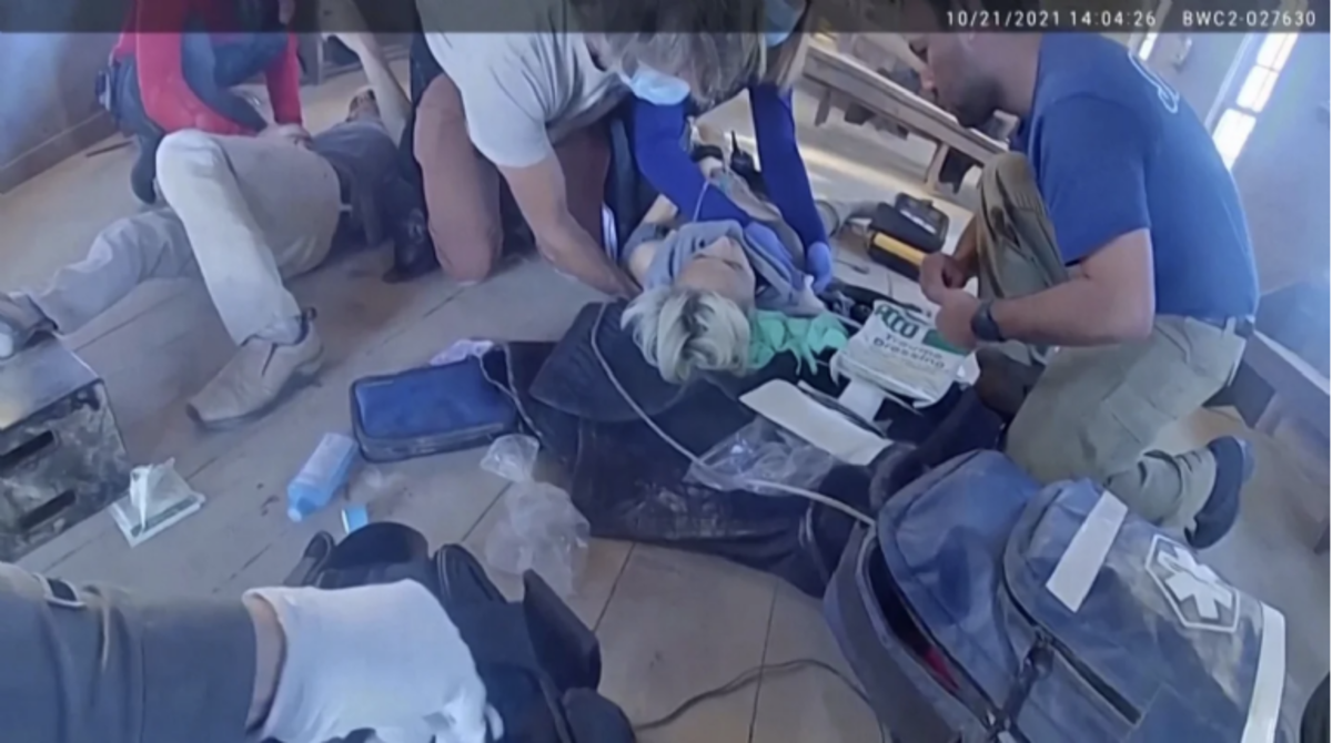 Las dramáticas imágenes fueron difundidas por la Oficina del Alguacil del condado de Santa Fe. En el clip se observan a los paramédicos y oficiales socorrer a la cinefotógrafa, que aún estaba viva, y al director Joel Souza previo a que los trasladen en las camillas hacia la ambulancia.