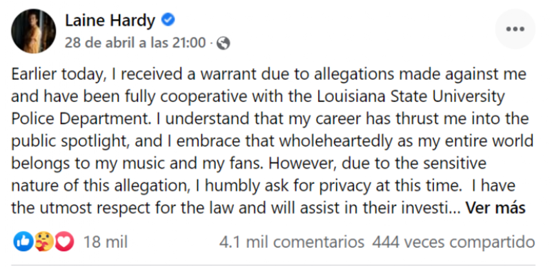 “Entiendo que mi carrera me ha puesto bajo la luz pública, y lo acepto de todo corazón, ya que todo mi mundo pertenece a mi música y mis fans. Sin embargo, debido a la naturaleza delicada de esta acusación, pido humildemente privacidad en este momento. Tengo el mayor respeto por la ley y colaboraré con la investigación según sea necesario”, escribió en su página en la red social.
