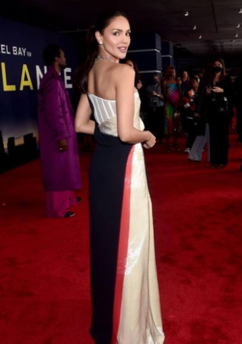 La intérprete ha portado un vestido largo repleto de lentejuelas blancas, sin hombros, combinado con una túnica bicolor en negro y rojo que luce en un único hombro, siendo sujetada sutilmente en la cintura del lateral opuesto. Eiza González ha apostado, además, por la corriente estilística del metálico. La mexicana se proclama, una vez más, como la reina de las aberturas sugerentes y del patronaje impecable.