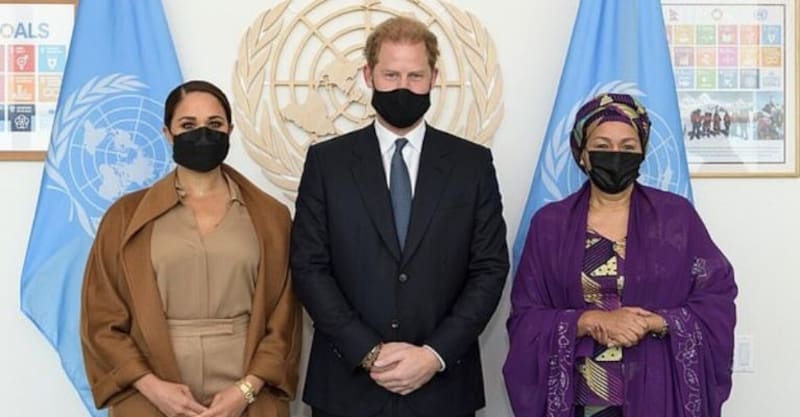 La pareja fue fotografiada frente al logo de la ONU junto con Mohammed y en otra donde Meghan la saluda con el codo. Mohammed fue ministra de medio ambiente en Nigeria y compartió las imágenes en su cuenta de Twitter. Los Sussex también se reunieron con Linda Thomas-Greenfield, la embajadora de Estados Unidos ante las Naciones Unidas. La diplomática también inmortalizó el momento en su cuenta de Twitter.