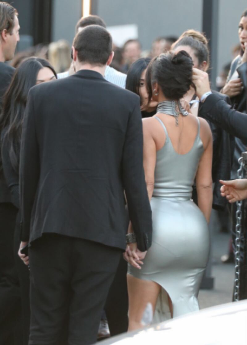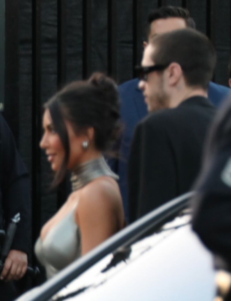 Kim deslumbró con su belleza que resaltaba en un vestido plateado del diseñador Thierry Mugler y Pete con un blazer negro y camiseta blanca y lentes oscuros.