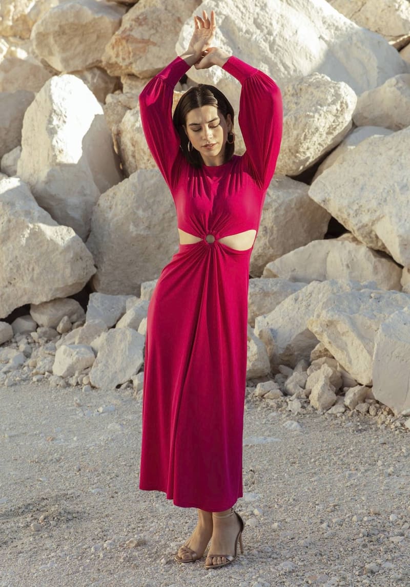 El vestido llegó a la altura de las rodillas con mangas largas con puños, detalle de arandela en el vientre y falda de largo midi. Además, lo elige en tono fresa, el cual es uno de los preferidos para esta temporada primaveral. Según los reportes, este vestido ya está agotado en su sitio web.