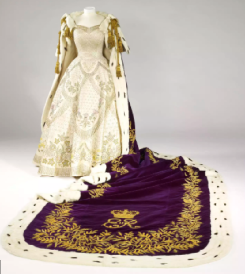 En el Castillo de Windsor estará su Vestido de Coronación, diseñado por Norman Hartnell, así como su túnica de terciopelo de seda púrpura de Estate y cinco broches que representan los emblemas de la Commonwealth.