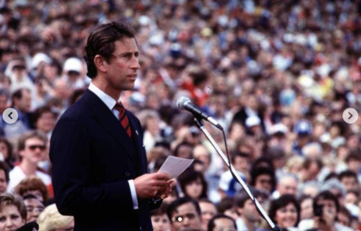 En 1983, el Príncipe visitó Edmonton para inaugurar los Juegos Universitarios Mundiales en el Estadio de la Commonwealth. En la imagen se le ve dando un discurso.