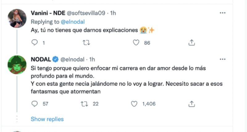 Esta sería la primera reacción de la cantante tras toda la polémica que desencadenó su prometido al balconear que efectivamente, la ojiverde sí le pedía dinero como se especuló desde hace mucho tiempo: “Cuando me canse de dar se acabó todo", escribió Nodal en el tuit en el que reveló la última última conversación que tuvo con Belinda.
