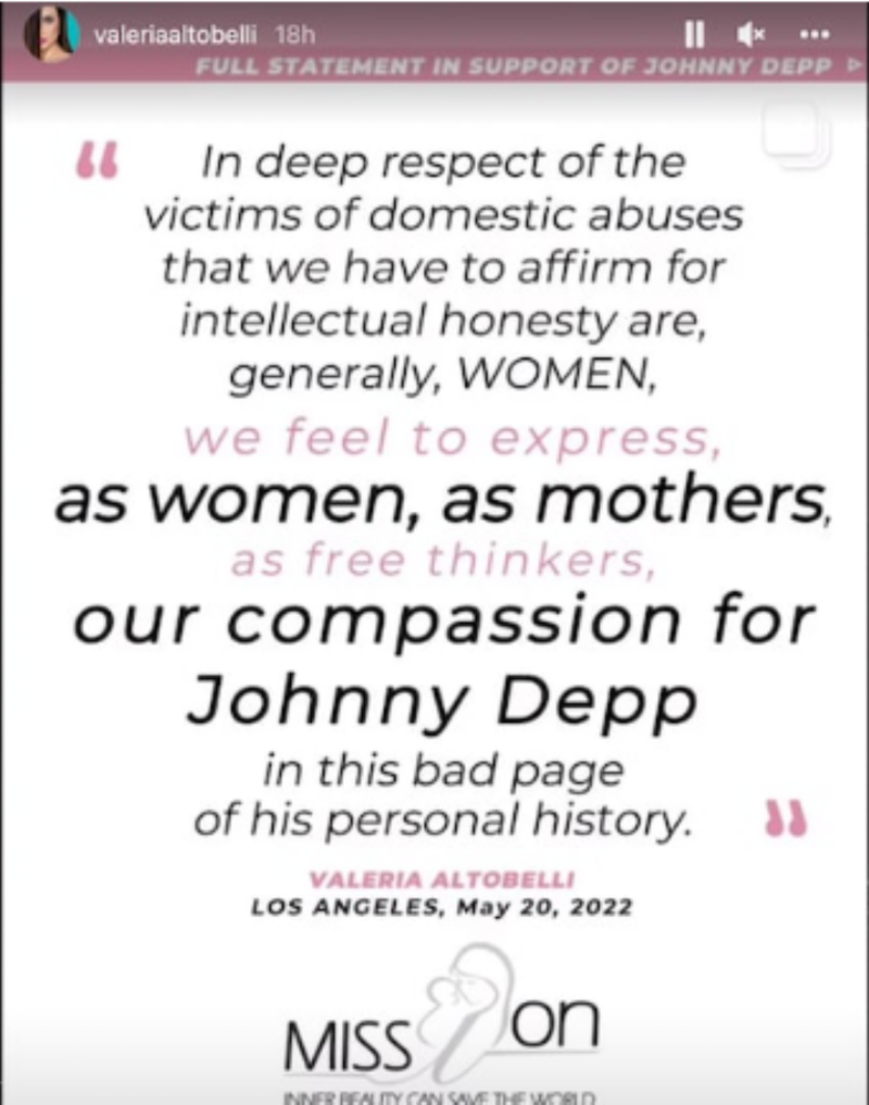 “Como mujeres, sentimos compasión y empatía no por LA estrella, EL talento, EL actor, sino por un hombre, un padre, un trabajador, una persona… En profundo respeto a las víctimas de abusos domésticos que tenemos que afirmar para la honestidad intelectual son, en general, MUJERES, sentimos que expresamos, como mujeres, como madres, como librepensadoras, nuestra compasión por Johnny Depp en esta mala página de su historia personal”, señala el comunicado que fue publicado en las historias de Altobelli.