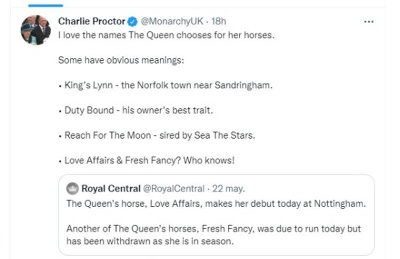 Uno de los caballos de la reina Isabel II, Love Affairs, hizo su debut este domingo en Nottingham, lo que causó gran controversia en internet pues también se informó que otro de los animales que participaría no podría hacerlo, Fresh Fancy. Esto fue tema de conversación, por lo que el periodista especializado en realeza Charlie Proctor, realizó algunos comentarios sobre los caballos de la monarca.