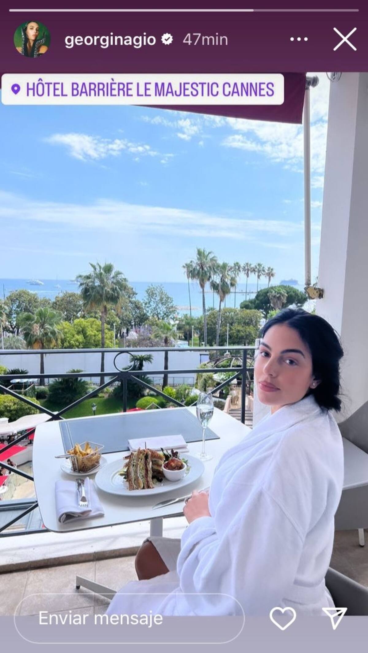 Georgina publicó una fotografía en su historia, en la que se le puede ver disfrutando de su desayuno y el paisaje, la empresaria luce una bata blanca, sin maquillaje, se está preparándose para su aparición en la alfombra roja del festival, expertos han declarado que será ella quien acapare las cámaras esta tarde.