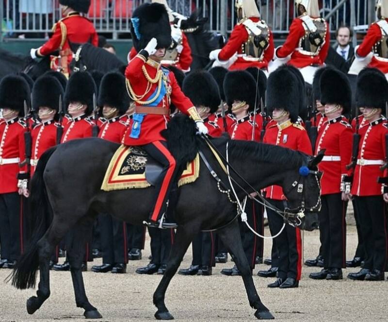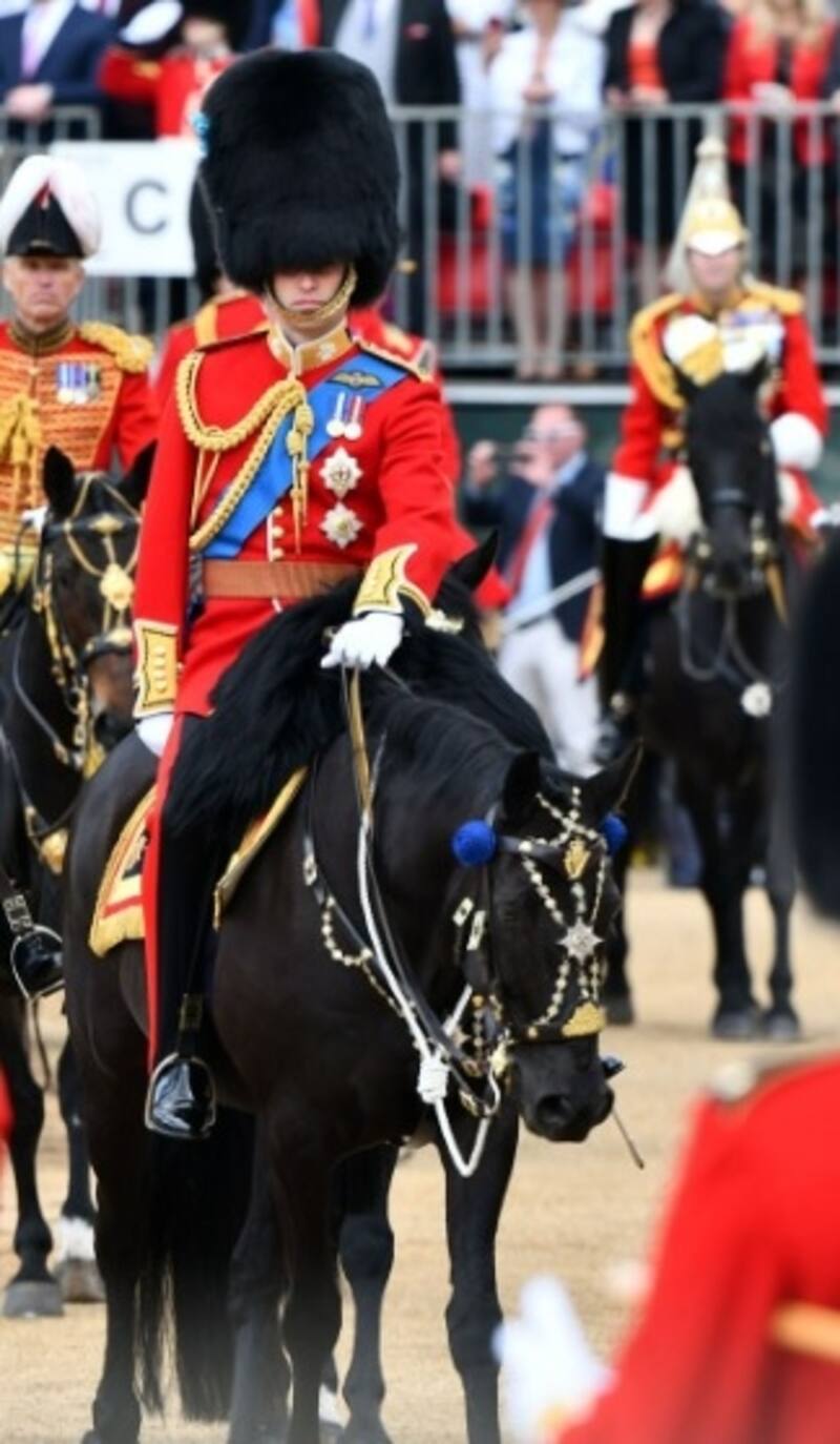 El duque de Cambridge, de 39 años, vestía uniforme militar rojo y azul, junto con el tradicional sombrero de piel de oso. En su pecho mostró medallas relucientes, mientras pasaba revista por la sesión de práctica, que se conoce como la Revisión del Coronel.