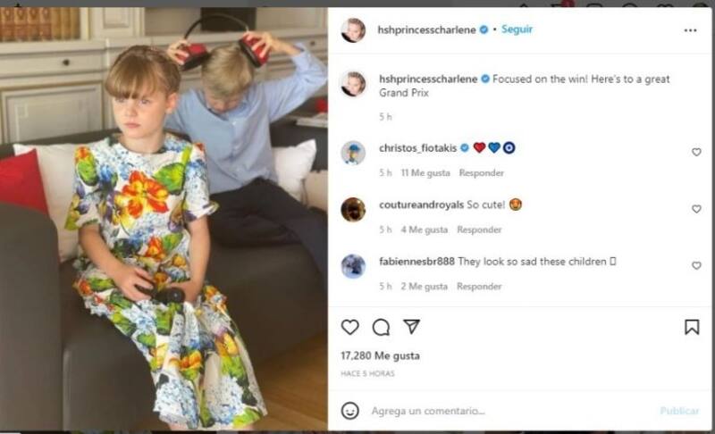 Este domingo, la princesa compartió en su cuenta de Instagram una fotografía de sus mellizos, Jacques y Gabriella, quienes estaban esperando el inicio de la carrera. “Enfocados en la victoria. Será un Gran Premio”, escribió Charlene.