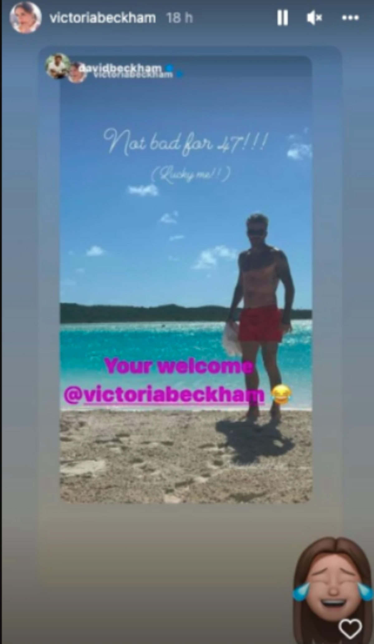 En la fotografía se ve a David en la orilla de playa luciendo un traje de baño color rojo y lentes oscuros mientras que la cantante escribió: “Nada mal para 47 (soy afortunada)” haciendo referencia al excelente físico que tiene el ex seleccionado de Inglaterra.