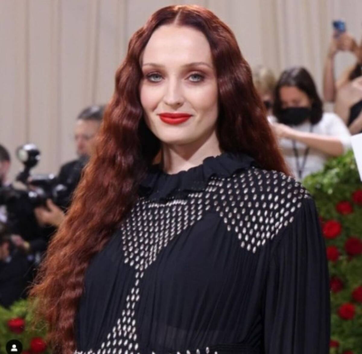 La actriz usó un vestido negro largo de Louis Vuitton en color negro, su pancita salía a relucir por la tela tableada que le daba un ligero volumen; en la parte del torso había transparencias con algunos detalles de pequeñas piedras en color blanco. Turner llevaba un maquillaje cargado con labios en color vino, del mismo tono de su larga cabellera ondulada que dejó suelta.