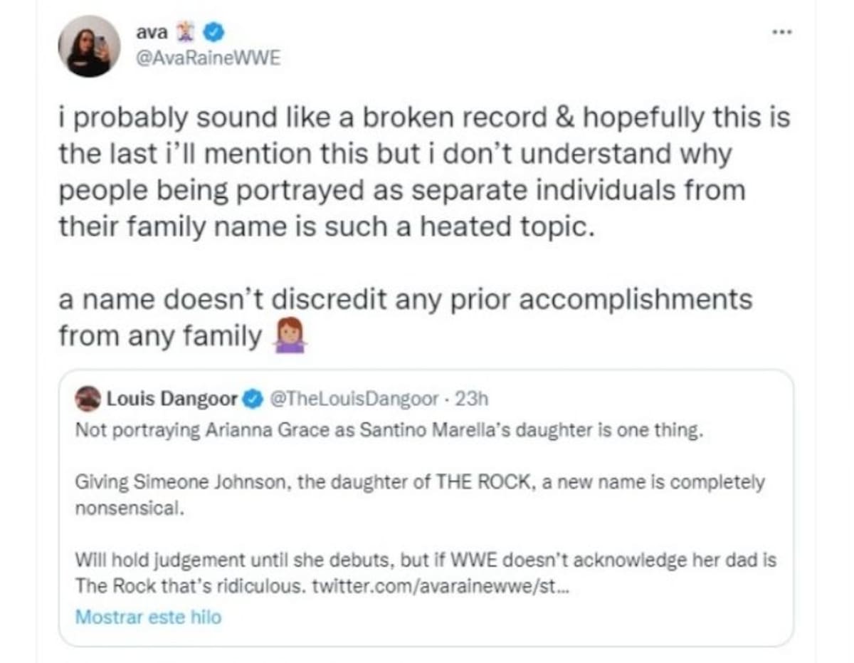 El periodista especializado en WWE, Louis Dangoor publicó un controversial tuit que llamó la atención de la hija del actor. “No relacionar a Arianna Grace como hija de Santino Marella es una cosa. Darle a Simones Johnson, la hija de LA ROCA, un nuevo nombre, es una completa tontería. Esto se mantendrá así hasta que debute, pero si la WWE no reconoce que su papá es La Roca, será una tontería”, escribió.