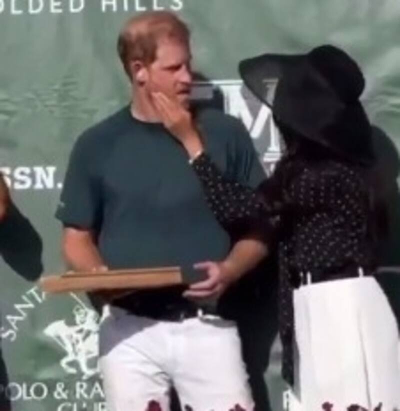 Un video de Tiktok muestra a la duquesa , que lleva un enorme sombrero negro para el sol, felicitando al equipo de su marido. Le ofrece a cada jugador un beso en cada mejilla antes de plantar un beso en los labios de Harry cuando el príncipe se inclina.