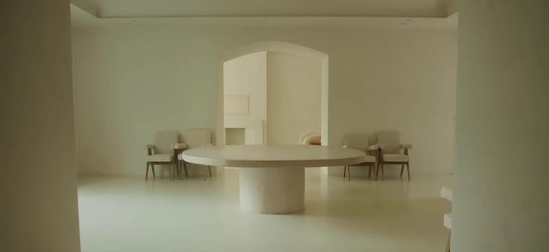 Kim mostró en primera instancia la parte de afuera, la entrada tiene una puerta enorme que se rodea de árboles, plantas y arbustos; en esta parte se pueden apreciar los ventanales que dejan ver el interior. Lo primero que se puede ver al entrar es una mesa de gran altura adornada con las pinturas que realiza North, su hija.