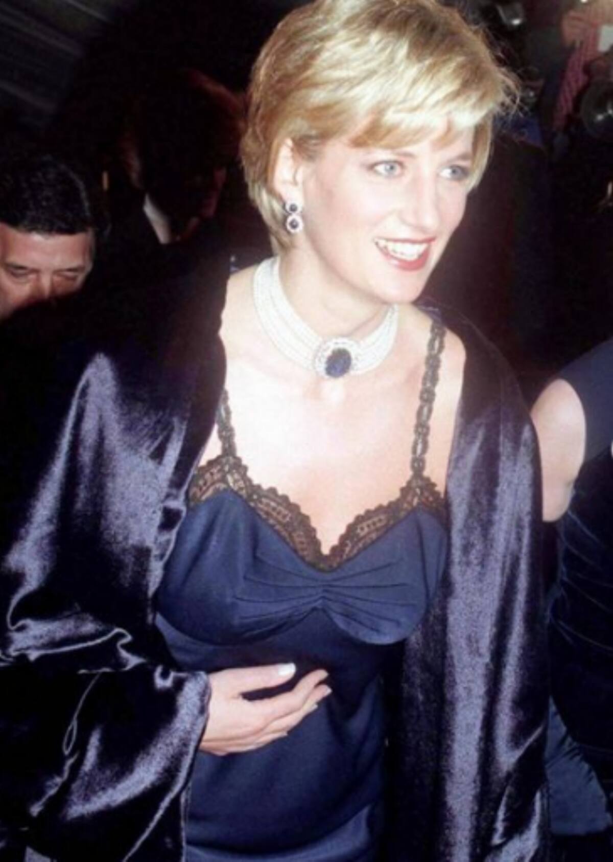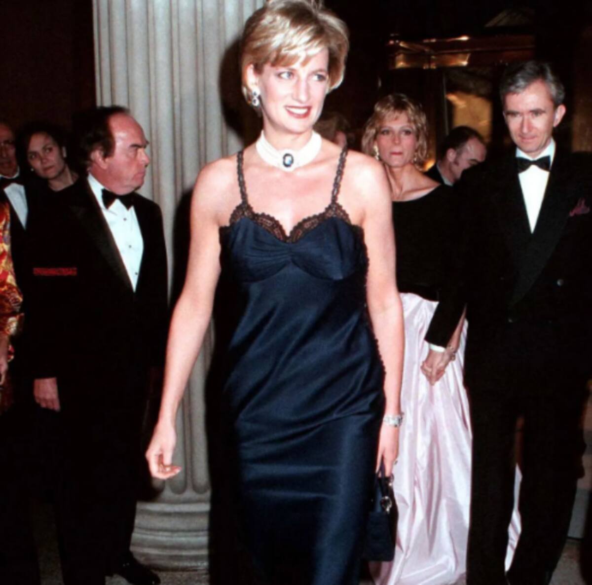 En ese momento, la princesa hizo historia al presentarse con un vestido lencero azul oscuro de John Galliano para Dior, con el cual llevó a juego un conjunto de joyas, conformado por pendientes y un collar de perlas con zafiros que le había regalado la Reina Isabel II por su boda con el heredero a la corona británica, Carlos de Inglaterra.