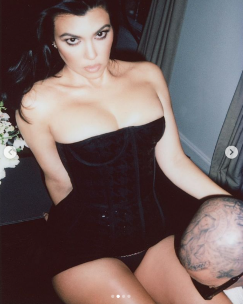 En las candentes imágenes Kourtney luce un corset negro y zapatos altos mientras Travis está sentado besándo las piernas de su prometida, de quién ha dicho estar profundamente enamorado y con quien hace unos meses se casó en una ceremonia en Las Vegas.