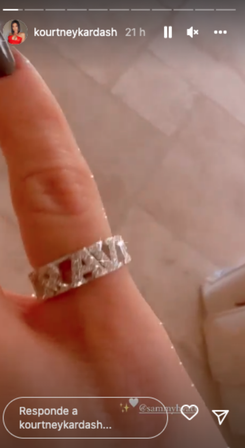 Por medio de su cuenta de Instagram, la mayor de las Kardashian mostró el flamante anillo con diamantes formando la palabra “Travis” que lució en el dedo meñique con un filtro que aportaba más brillos.