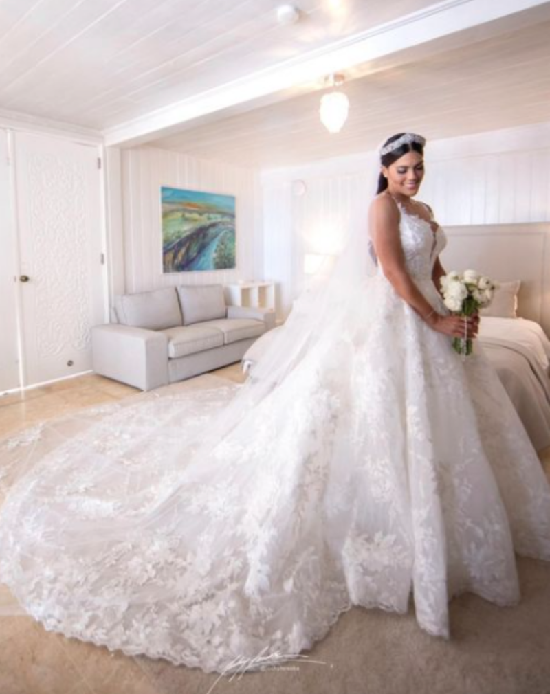 El primero de los vestidos fue con el que llegó al altar una prenda de Monique Lhuillier completamente blanca con escote en V con tul y encaje bordados con flores blancas que resaltaban la belleza de la flamante novia que también portaba una tiara de cristales con un hermoso velo.
