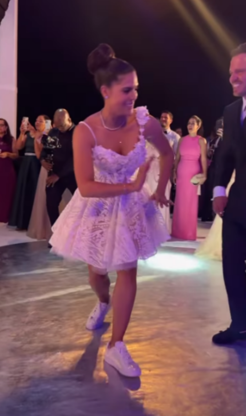 Ya entrada la madrugada, la dominicana tuvo un tercer cambio, un vestido corto blanco con detalles bordados y para poder estar más cómoda y disfrutar plenamente se puso tenis con brillos y se recogió el pelo para seguir bailando.