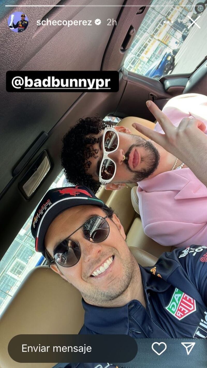 Uno de los cantantes del momento, Bad Bunny, apareció en redes al lado del piloto mexicano Sergio "Checo" Pérez, quien forma parte del equipo Red Bull. El reguetonero posó junto a Sergio este día de carrera, al parecer la presenciará desde la primera fila pues durante el fin de semana estuvo posteando fotos en las que se podía ver que se encontraba en el área donde resguardan los autos.
