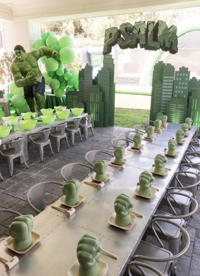 La celebración tuvo temática de Hulk, uno de los superhéroes favoritos de Psalm. Hubo puños para los invitados que jugaron con ellos, la decoración fue con globos verdes e incluyó una figura de tamaño real, además de dulces, malteadas y por supuesto, el pastel con el puño de este personaje.