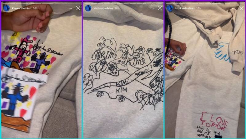 Se trató de un jogger y una sudadera, en color gris, en los cuales todos hicieron algunos dibujos y escribieron las palabras “mamás”, “Kim”, “Te amo mamá. Este soy yo y mi mamá”. North, que de acuerdo con Kim es una gran artista, se encargó de la decoración de la sudadera, mientras que Saint agregó una de sus manos en el jogger y un dibujo de dos figuras humanas.