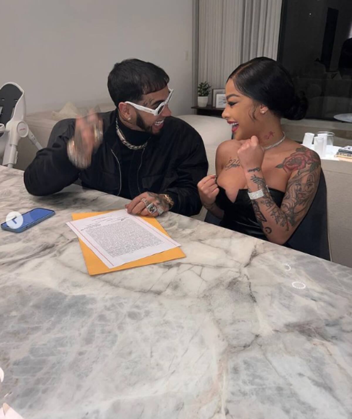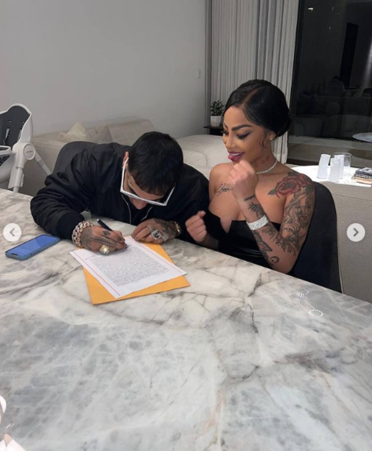 Por medio de su cuenta oficial de Instagram, Yailin compartió una serie de fotografías en las que se ve a la pareja, vestidos de negro firmando unos documentos, que presuntamente sería el acta matrimonial sobre una mesa de mármol, pero un detalle que no pasó desapercibido fue que detrás de ellos hay una sillita de bebé ¿Será que pronto cumplirán el sueño de ser papás?
