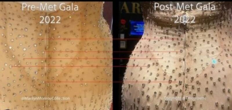 Además, muestran que hay muchos espacios entre un cristal y otro, así que deducen que se cayeron por el uso, dejando hilos salidos, colgados y cristales a punto de caerse, además de la tela desgarrada. “Una comparación de fotos antes y después con cristales perfectamente alineados. Y sí, es el mismo vestido en las fotos del antes y después”, fue el mensaje que escribió Scott Fortner en esta cuenta dedicada a las colecciones que tiene de Monroe.