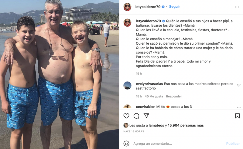 Por medio de una publicación en su cuenta oficial de Instagram, Calderón subió una foto de sus hijos Carlo y Luciano con su papá Mario Calderón y escribió  un texto en el que hizo referencia a que ha sido ella quien ha estado en todos los momentos importantes de sus hijos como mamá soltera.