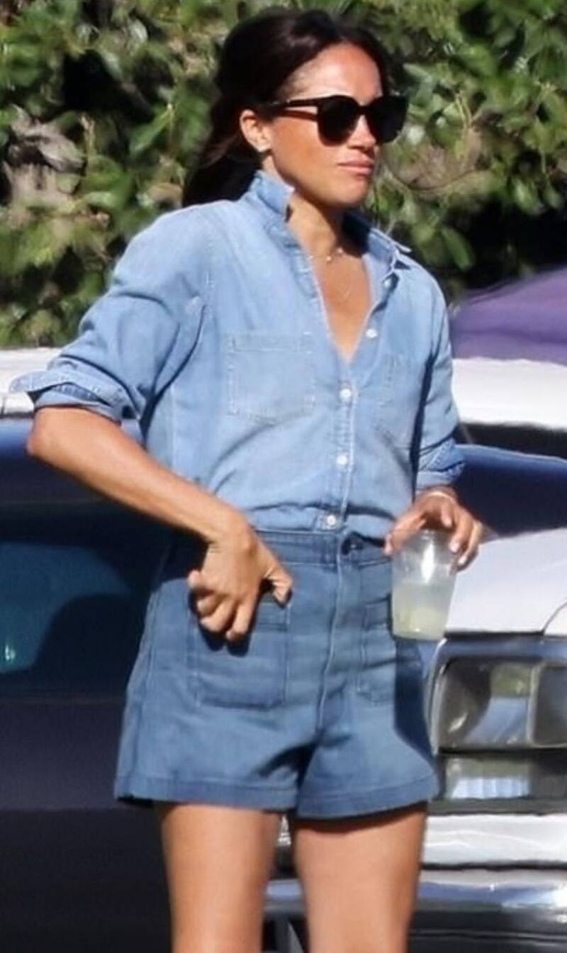 Vestida casualmente con una blusa estilo denim, pantalones cortos de mezclilla y sandalias griegas planas de cuero, la duquesa de Sussex observó el partido con atención, siempre con un vaso de limonada en la mano.