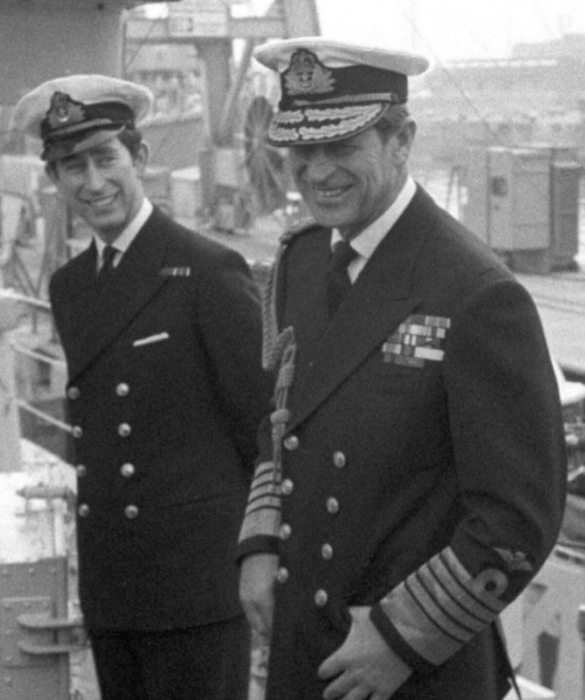Carlos y el Príncipe Felipe con uniformes de la Marina Real Británica.