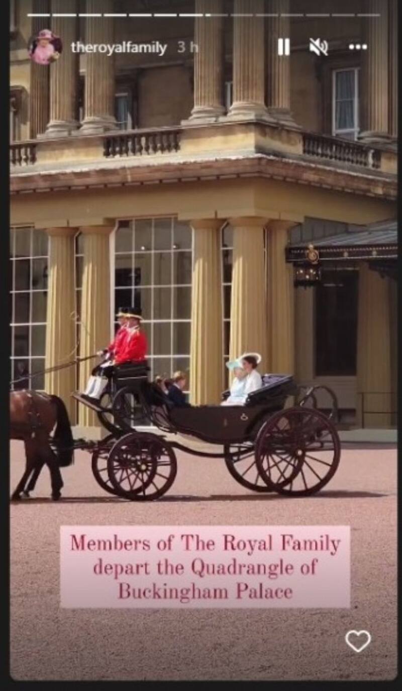 A través de las redes oficiales de la Familia Real, han compartido los últimos pasos de la monarca, que subió a un carruaje que la llevó a saludar a las miles de personas que acudieron a este primer día de celebración; sus bisnietos fueron protagonistas, el trio se sentó frente a ella y a su lado se colocó Middleton.
