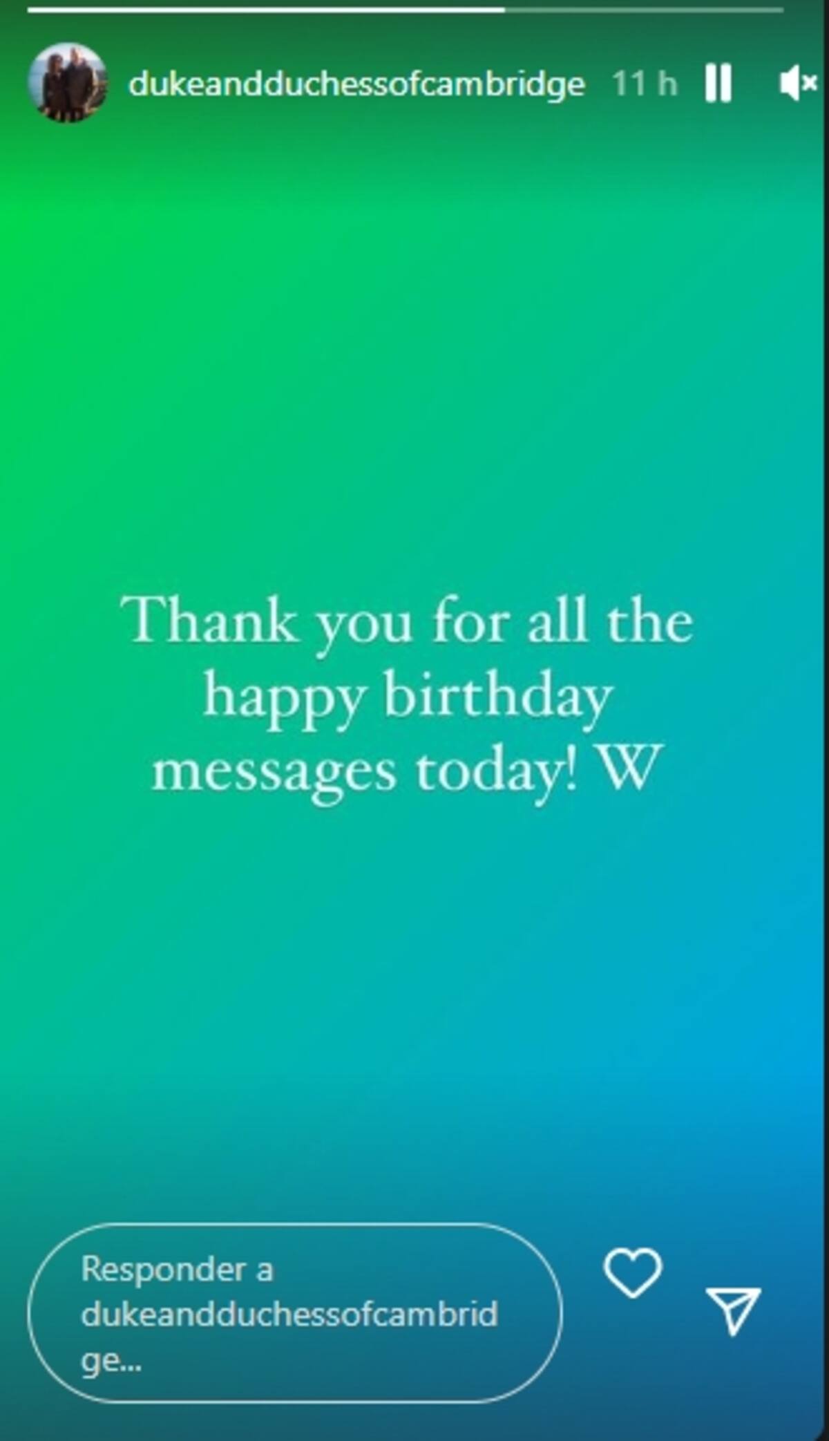 En su cuenta de Instagram, el primogénito de la princesa Diana agradeció a todos aquellos que se tomaron el tiempo de dedicarle unas palabras con un pequeño mensaje firmado por él: "Gracias por todos los mensajes de cumpleaños que recibí hoy W", escribió en sus stories.