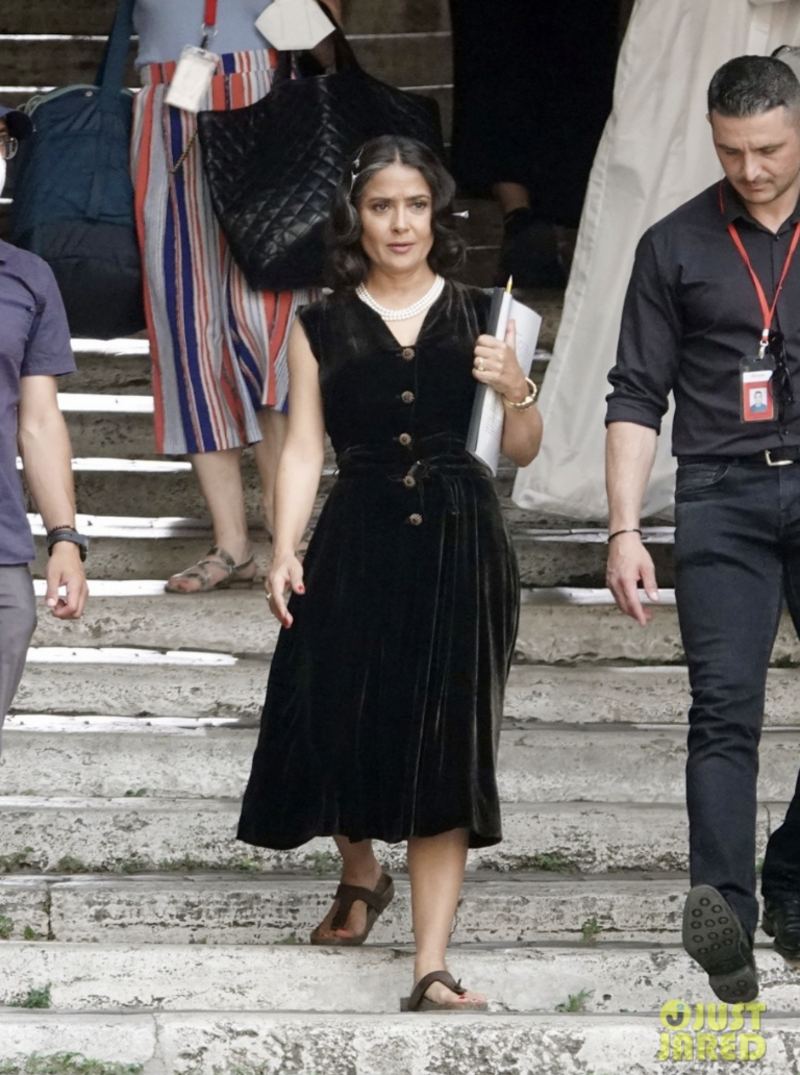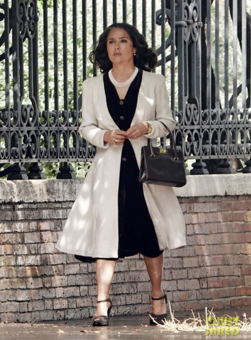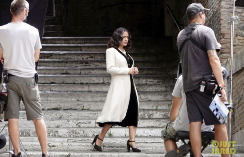 Pese a que aún no hay información sobre sus personajes, Angelina Jolie lució un jumper blanco mientras se protegia del sol con un sombrero y lentes de sol negros, mientras que Salma usó un vestido negro con un abrigo beige por encima y perlas para sus escenas.