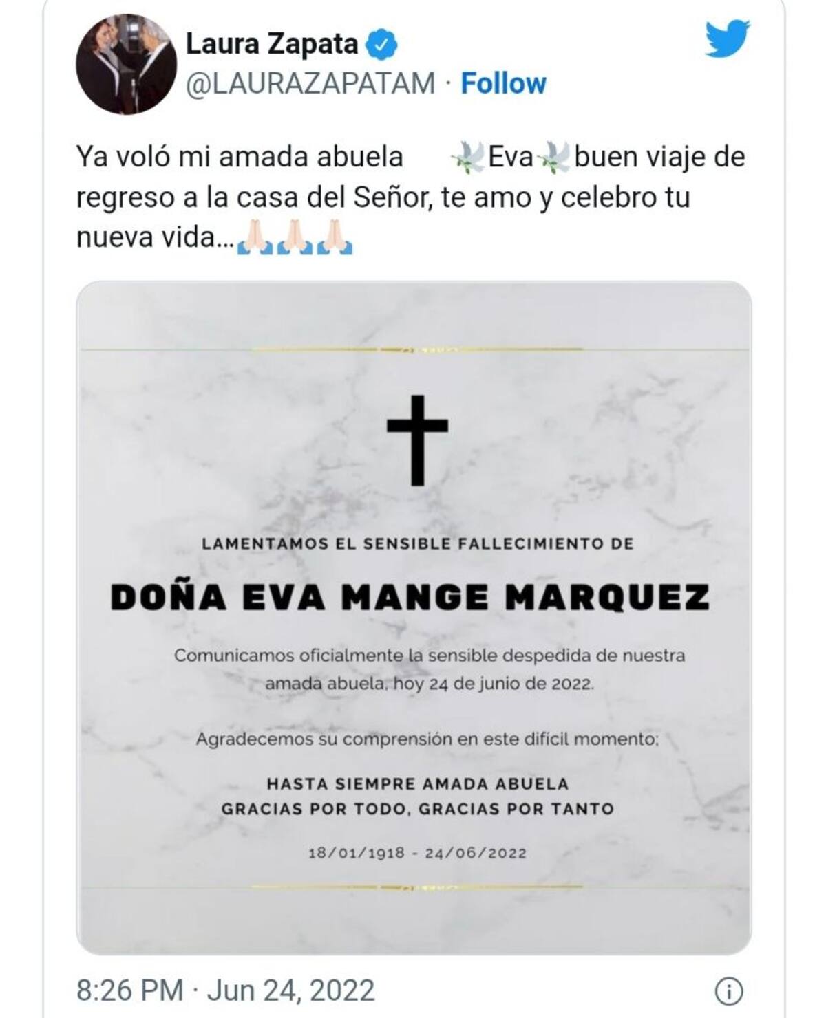 La noche del viernes, Thalía y Laura Zapata informaron del lamentable fallecimiento de su abuelita, Eva Mange, quien a los 104 años murió por complicaciones a su salud.
