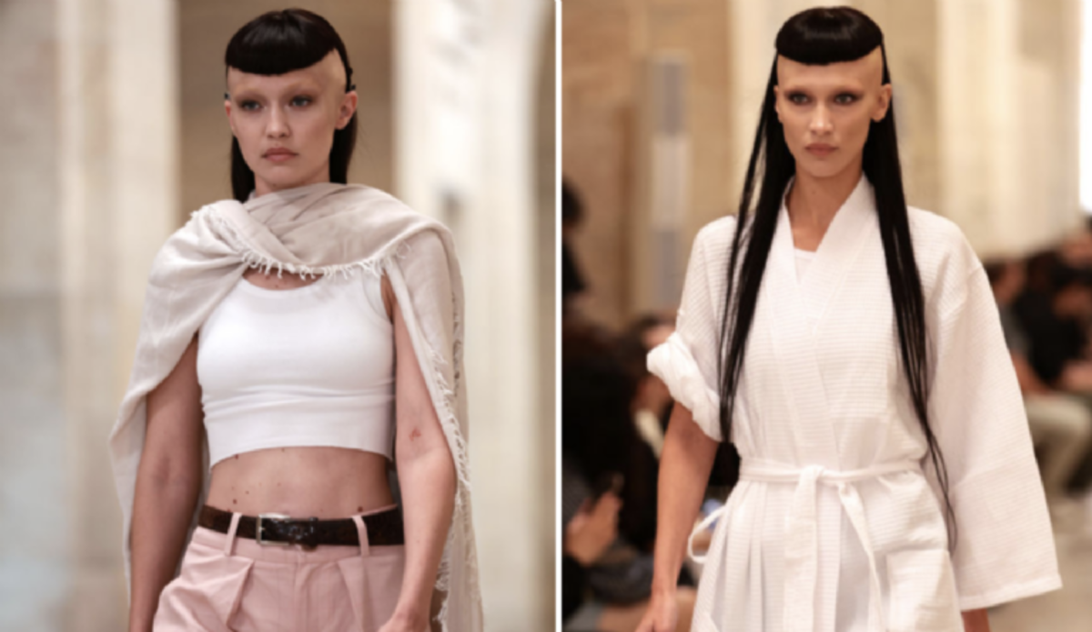 Las modelos, quienes son de las favoritas por la casa de diseño para lucir sus piezas impactaron luciendo irreconocibles con un look punk inesperado con pelo negro rapado por los lados y mini flequillo recto.