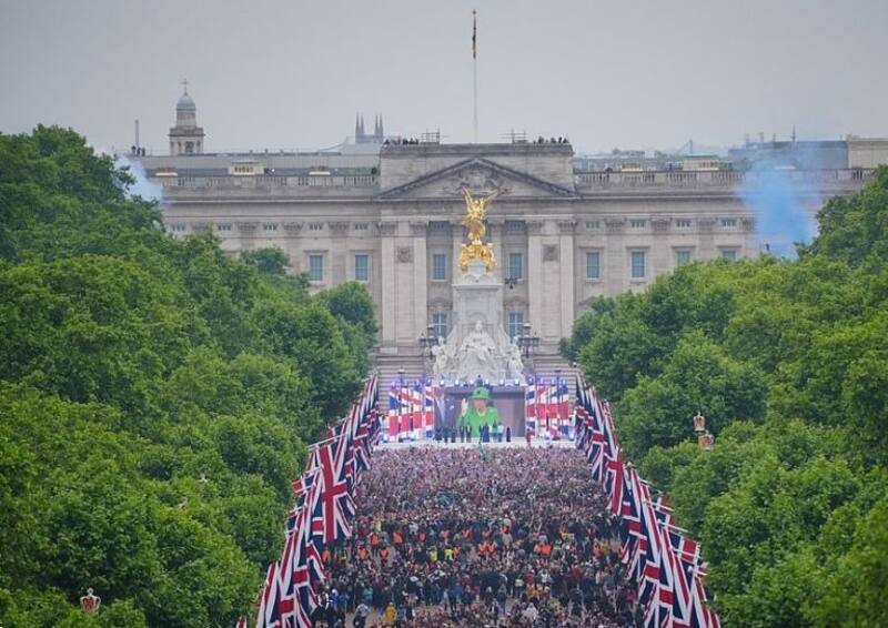 Cerca de 200 celebridades nacionales, incluidos Sir David Jason, Harry Redknapp, Sandie Shaw, Felicity Kendal, Joe Wicks y Holly Willoughby, se unieron a la sensación pop Ed Sheeran en una interpretación masiva de "God Save The Queen" fuera del Palacio de Buckingham al final del desfile.