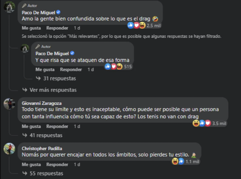 Por medio de su cuenta personal de Facebook, Paco de Miguel contestó las malas críticas: “Amo la gente bien confundida sobre lo que es el drag”, “Que risa que se ataquen de esa forma”, sentenció.