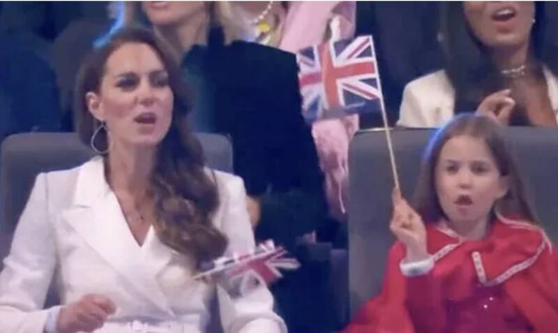 La duquesa de Cambridge y la pequeña princesa, de siete años, estuvieron sentadas pero no impidió que Charlotte bailará moviendo los hombros mientras ondeaba una bandera de Gran Bretaña, lo mismo que su mamá, quien también aparece cantando en un video que se hizo viral en redes sociales.