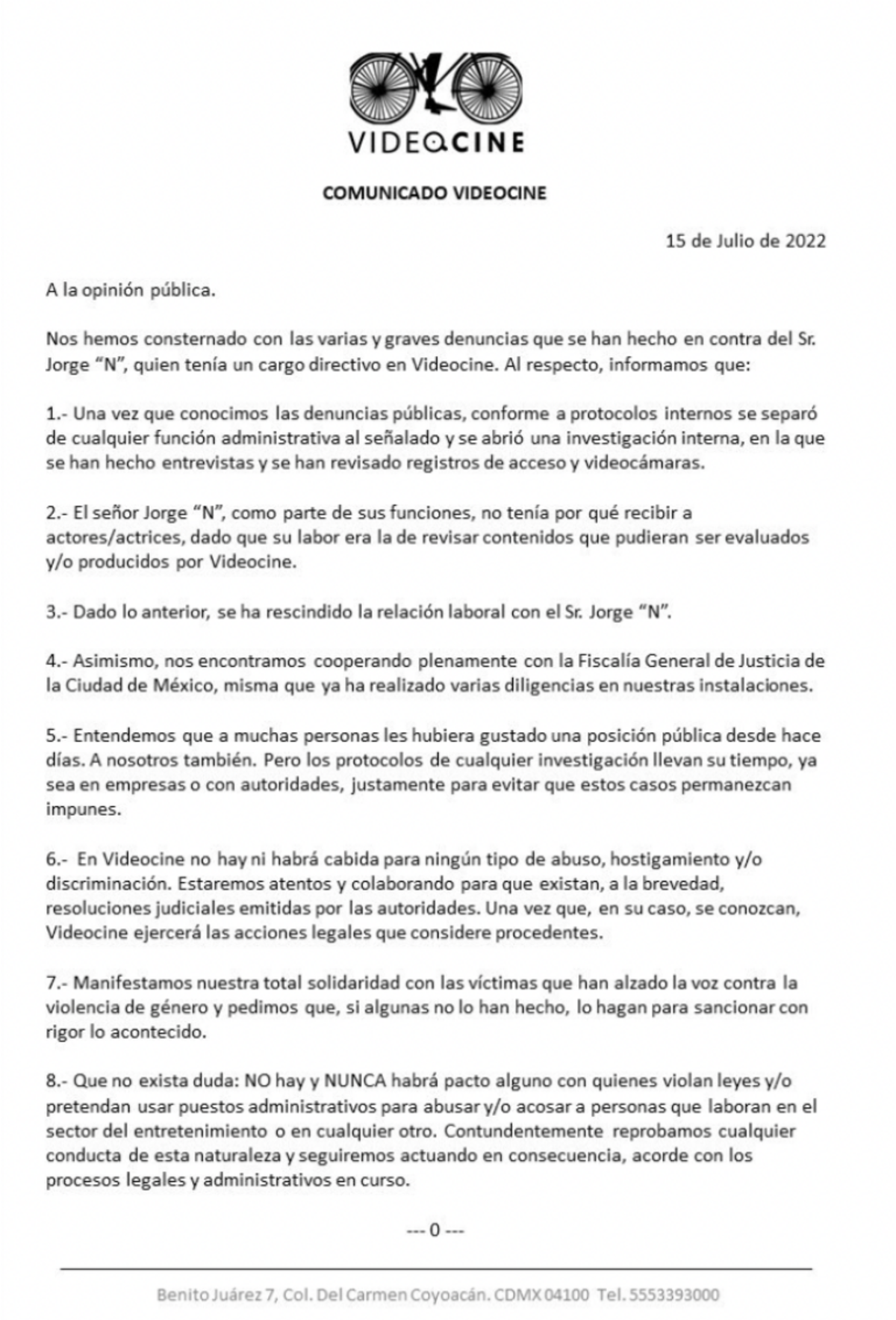 “Entendemos que a muchas personas les hubiera gustado una posición pública desde hace días. A nosotros también. Pero los protocolos de cualquier investigación llevan su tiempo, ya sea en empresas o con autoridades, justamente para evitar que estos casos permanezcan impunes”, dice la distribuidora en su comunicación oficial. Hasta el momento Coco Levy no se ha manifestado sobre las medidas que tomó Videocine que lo separaron de su cargo.