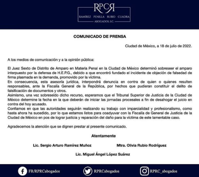 "El Juez de Distrito de Amparo en Materia Penal en la Ciudad de México determinó sobreseer (suspender) el amparo interpuesto por la defensa de H.E.P.G., debido a que encontró fundado el incidente de objeción de falsedad de firma plasmada en la demanda, promovido por la víctima", se lee en el comunicado firmado por la abogada Olivia Rubio Rodríguez y que fue publicado Instagram.