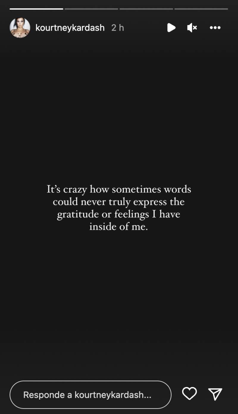 Además Kourtney compartió un pensamiento que expresa sus sentimientos: "El lenguaje y la voz llevan energía pero tu corazón es más poderoso. Lo que tu corazón y tu alma sienten va más allá de una pequeña combinación de letras. Me encanta la cita de Rumi "Cerré los ojos y hablé contigo de mil maneras silenciosas".