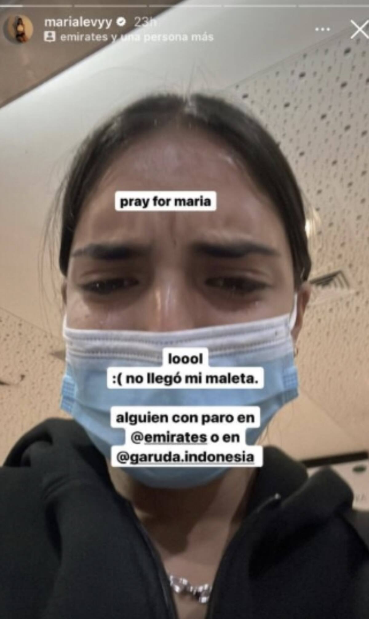 Con una profunda tristeza e incluso derramando lágrimas, la hija de Ariel López Padilla contó que su maleta no llegó y solicitó ayuda de la aerolínea en la que viajaba para poder solucionar el inconveniente: "Recen por María. No llegó mi maleta. Alguien con paro en Emirates o en Garuda Indonesia".