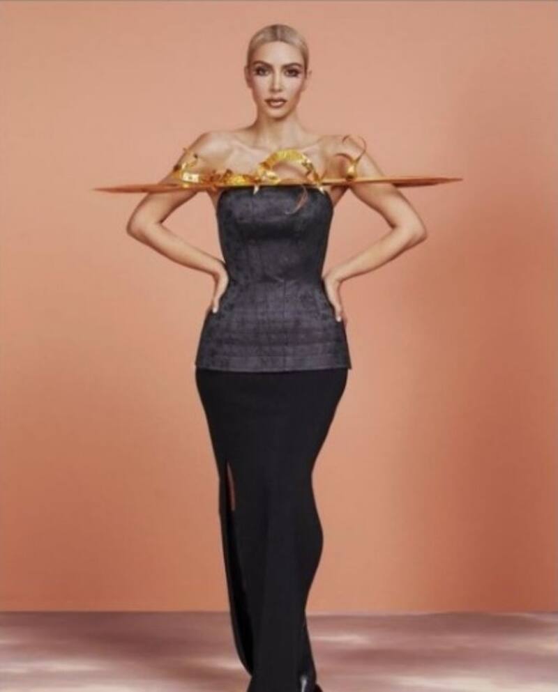En otro retrato ocultan su cabello y dejan ver, ahora sí, un vestuario llamativo en color negro, está usando un corsé largo que acompaña con una falda que de apertura en la pierna. En la parte de arriba le colocaron un accesorio dorado muy grande que cubre el ancho de su cuerpo.