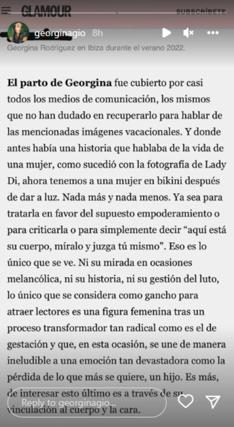 "El parto de Georgina fue cubierto por casi todos los medios de comunicación, los mismos que no han dudado en recuperarlo para hablar de las mencionadas imágenes vacacionales. Y donde antes había una historia que hablaba de la vida de una mujer, como sucedió con la fotografía de Lady Di, ahora tenemos a una mujer en bikini después de dar a luz.