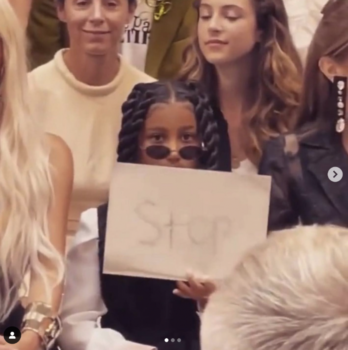 Fue durante el desfile de Jean Paul Galtier que la hija de Kim Kardashian y Kanye West aprovechó que las cámaras estaban frente a ella y mostró un pedazo de papel con la palabra "Alto", con el que pidió a la prensa que dejen de verla y que se concentraran en el despliegue de moda.